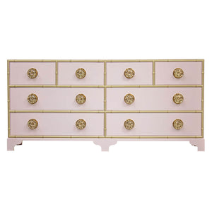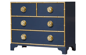 Large pinwheel drawer pulls made of cast brass in the shape of a flower, characterize this chest of drawers designed by Dorothy Draper. She specified this chest in her work at the Arrowhead Springs Hotel in the San Bernardino Mountains of Southern California. In the basic style of Chinese Chippendale, the Pinwheel Chest features four drawers with split bamboo molding around each drawer. Made of Cherry and available in wood or painted finishes. Painted accents on moldings are optional.
