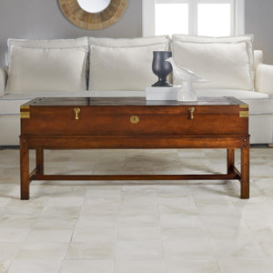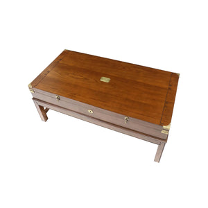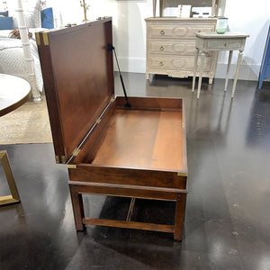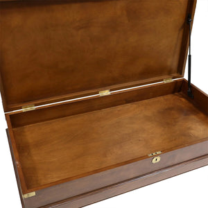 Large English Gun Case Coffee Table in the antique English Campaign style. The large lift-top wooden coffee table provides ample storage in a unique traditional style. With brass mounts and pulls. Raised on a Georgian style molded edge H form stretcher base.