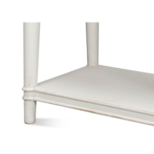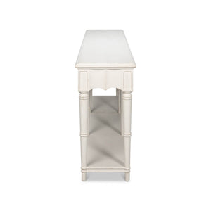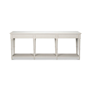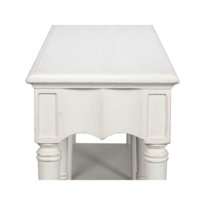 A Large French Country console table in a hand-rubbed antique white finish. The front apron of this piece has a beautiful fluted design. It has three drawers, eight turned and tapered legs, and a shelf stretcher base.