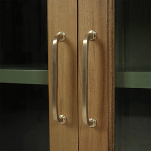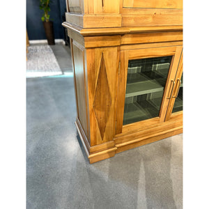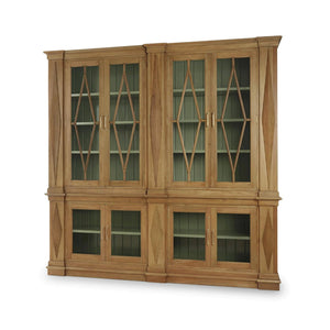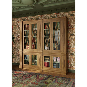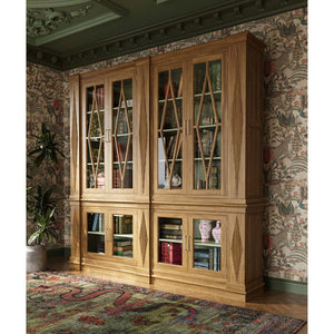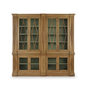 Rooted in architectural tradition and classical refinement, the Large Neoclassic Wooden Bookcase makes a commanding statement in any interior. Shown in Antique French Oak finish, this monumental cabinet features diamond-patterned fluted detailing, crown moulding, and symmetrical glass doors with matching lozenge designs. The painted interior, finished in Willow Shiny Green, adds a soft and sophisticated contrast that highlights books, objets d'art, or fine collectibles.