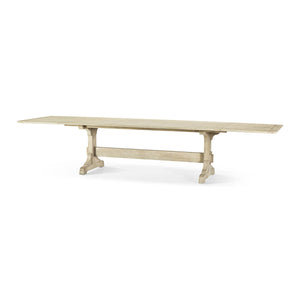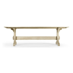 Light European Trestle End Dining Table, this extension table opens to 148" in length and can seat up to 14 people. Stripped oak is finished in light ash, and has a rustic feel with a modern updated finish. Raised on trestle ends with a stretcher base.