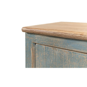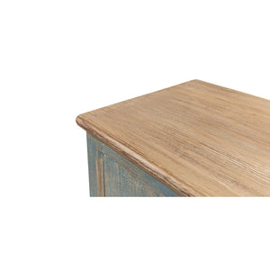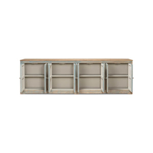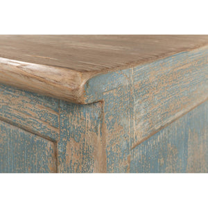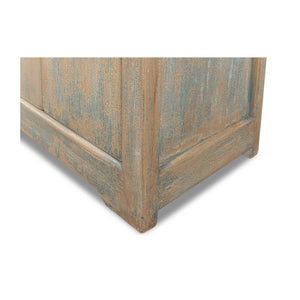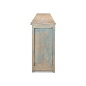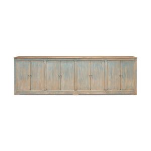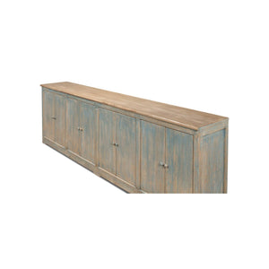 Long Bluewash Country Buffet, an eight door pine sideboard cabinet with a soft painted rub through antiqued bluewash finish with a natural finish top. Doors open to reveal a painted interior with removable shelves.