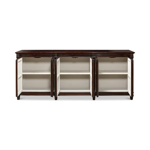Sized generously at 96" W x 20" D x 39" H, it provides ample storage with a painted interior and removable shelves, perfect for organizing tableware, linens, or other essentials. This buffet not only serves as a functional storage solution but also as a striking focal point in any room, blending seamlessly with both traditional and contemporary decor.