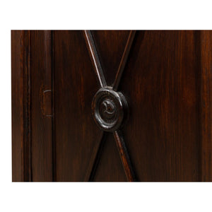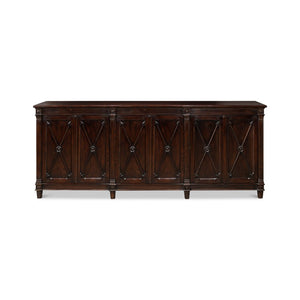 Elevate your dining experience with our Long Directoire Style Dark Brown Buffet. This piece features a hand-rubbed and distressed dark brown stain finish, complementing its six doors adorned with a classic cross-arrow design. Crafted from high-quality pine, this buffet offers a rustic, antiqued finish that exudes old-world charm and sophistication.
