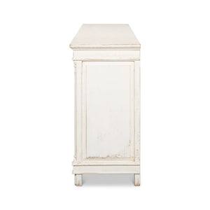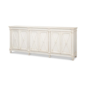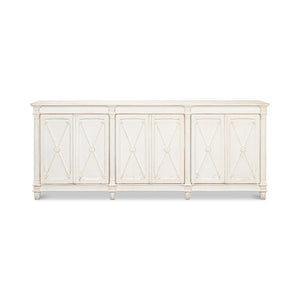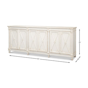 Elevate your dining experience with our Long Directoire Style White Buffet. This piece features a hand-rubbed and distressed whitewash-painted finish, complementing its six doors adorned with a classic cross-arrow design. Crafted from high-quality pine, this buffet offers a rustic, antiqued finish that exudes old-world charm and sophistication.