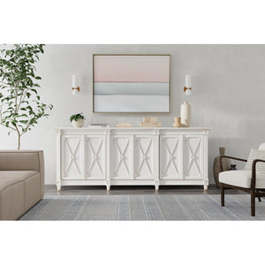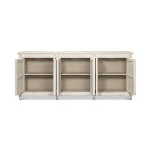 Sized generously at 96" W x 20" D x 39" H, it provides ample storage with a painted interior and removable shelves, perfect for organizing tableware, linens, or other essentials. This buffet not only serves as a functional storage solution but also as a striking focal point in any room, blending seamlessly with both traditional and contemporary decor.