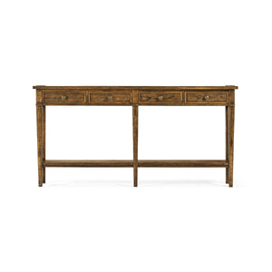 Long Narrow Country Console - Walnut Finish. This rectangular hall table has a rustic country finish with a paneled top showing exposed saw marks above four drawers set on square tapered legs with a shelf stretcher base.
