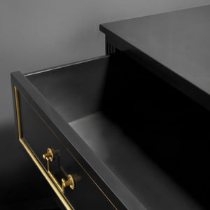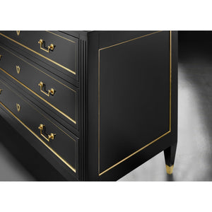 Classic brass accents and hardware provide a touch of grandeur, perfectly complementing the deep black finish. The soft-close drawers offer both luxury and functionality, ensuring effortless use while preserving the integrity of its design. Whether placed in a stately bedroom, a grand hallway, or an elegant living space, this commode embodies classic charm with a contemporary edge, making it an impeccable statement piece for the most discerning interiors.