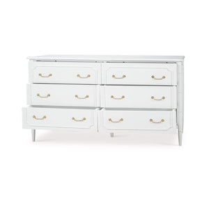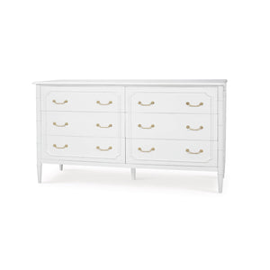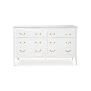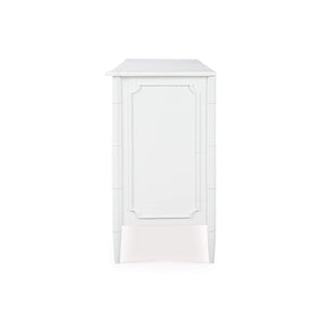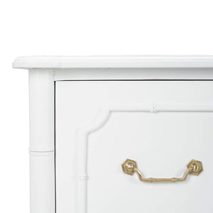 Elevate your home decor with the stunning Mid Century Modern White Painted Dresser. Influenced by the English Regency period, this exquisite piece features a sleek, lightly distressed architectural white painted finish that effortlessly brightens any room. Its elegant faux bamboo design brings a touch of nature-inspired charm, seamlessly blending with mid-century modern aesthetics. Adorned with chic gold handles, this dresser adds a hint of sophistication and glamour to your living space.