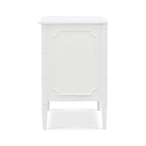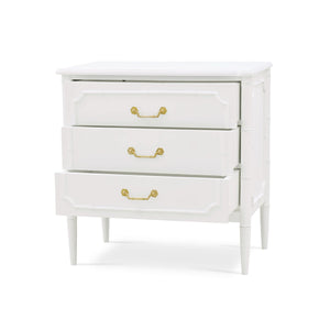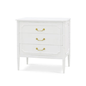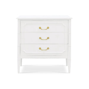 Elevate your home decor with the stunning Mid Century Modern White Painted Nightstand. Influenced by the English Regency period, this exquisite piece features a sleek, lightly distressed architectural white-painted finish that effortlessly brightens any room. Its elegant faux bamboo design brings a touch of nature-inspired charm, seamlessly blending with mid-century modern aesthetics. Adorned with chic gold handles, this dresser adds a hint of sophistication and glamour to your living space.