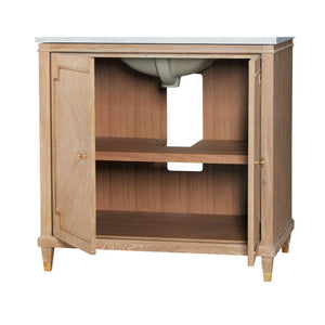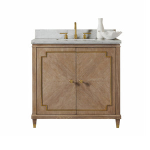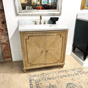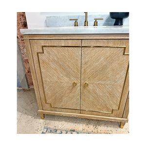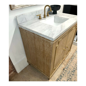 Elevate your bathroom with the timeless elegance of the Mid Century Oak Bathroom Vanity. The light cerused finish highlights the wood's natural grain, while geometric panel details and brass accents add architectural sophistication. A luxurious White Carrara marble top crowns the piece, creating a perfect balance of durability and style.