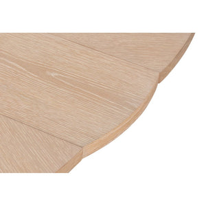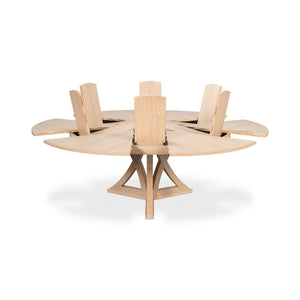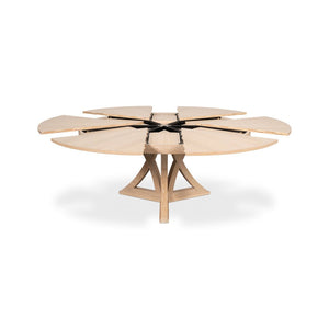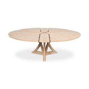 The Modern Bleached Oak Jupe Dining Table brings a timeless 19th-century innovation into the modern age. Crafted from oak in a light natural bleached oak finish, the table features a striking radial-patterned top and a unique, geometric base that blends elegance with contemporary style.