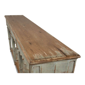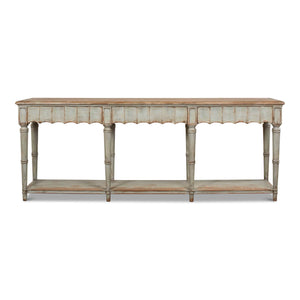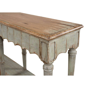 A Large French Country console table. This beautiful table has a natural top with a lightly distressed painted finish in soft sage green. The front apron of this piece has a beautiful fluted design. It has three drawers, eight turned and tapered legs, and a shelf stretcher base.