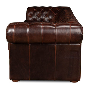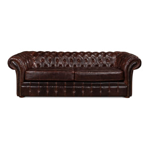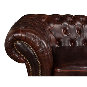 A tufted leather chesterfield sofa upholstered in rich traditional brown leather. A take on the traditional 19th century English design with tufted rolled arms and backrest with split cushion seat.
