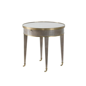 The Modern Neo Classic Round Side Table effortlessly blends traditional design with contemporary style. Modeled after an 18th-century French Louis XVI Bouillotte table, this piece features classic details such as brass trim and square tapered legs with brass caster feet. However, the table's exotic greyed Sycamore wood finish and sleek mirrored top provide a modern touch. With its compact dimensions, this versatile table is perfect for smaller living spaces or as a stylish accent piece in any room.