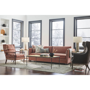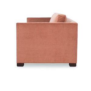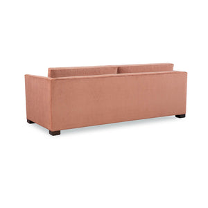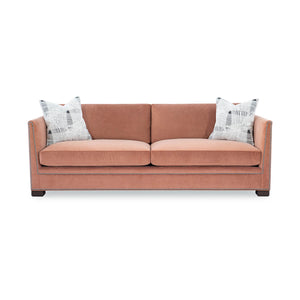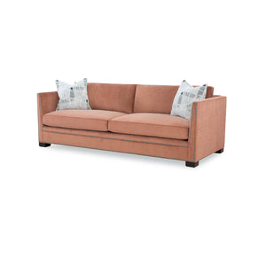 Modern Thorpe Sofa, a Modern upholstered sofa with sleek modern lines and raised on bold block feet. Two long loose pillow backs with two long comfort down seat cushions.