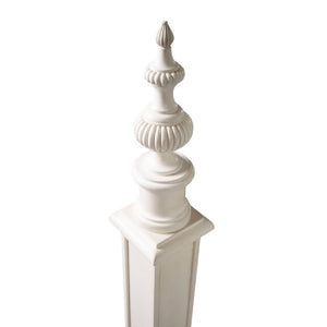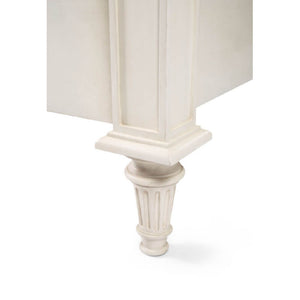 French Neo Classic four-poster king-size bed. Two carved posts topped with finials frame a tufted inset headboard with scalloped edges. The theme is reprised in an open-toe poster footboard. Set on turned and fluted feet.
