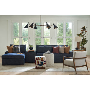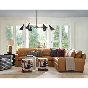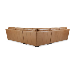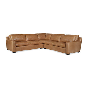 Nest Custom Sectional Sofa, a Modern leather upholstered sofa with bold modern lines and raised on bold square block feet. Long loose pillow backs with two long comfort down seat cushions.