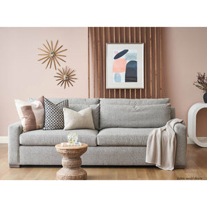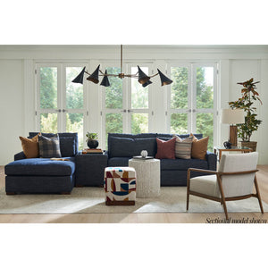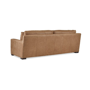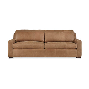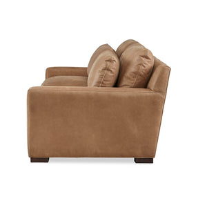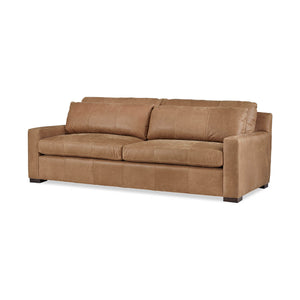 Nest Deep Custom Leather Sofa, a Modern leather upholstered sofa with bold modern lines and raised on bold square block feet. Long loose pillow backs with two long comfort down seat cushions.