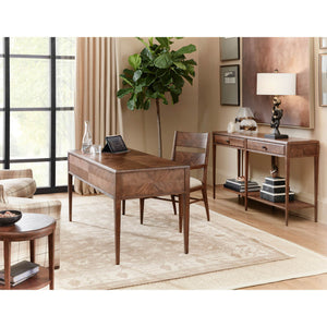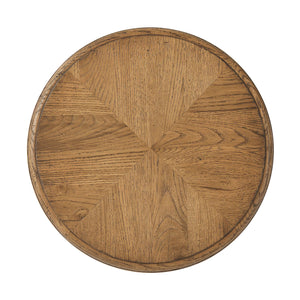 A light oak parquetry round side table with tapered oak legs. This beautiful round two-tier side table has an arranged radial design on its oak parquetry top and shelf.