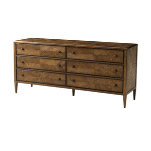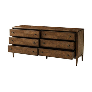 A dark oak parquetry six-drawer dresser in Dusk finish. This beautiful hand-carved oak dresser includes six drawers with mirrored herringbone starburst parquetry finished with Verde Bronze handles on classically tapered oak legs.  A perfect dresser for those looking for ample storage.