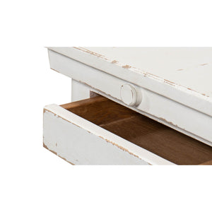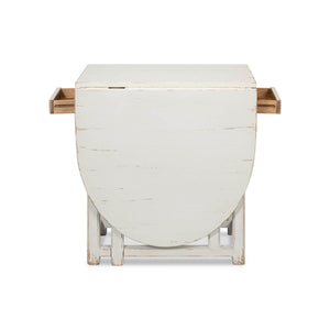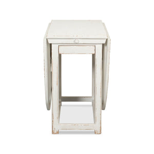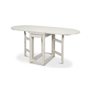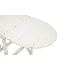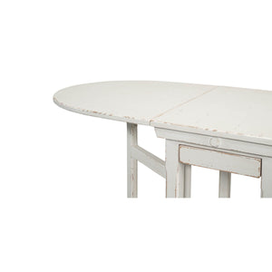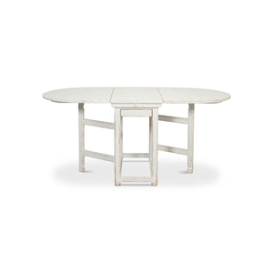 Experience the transformative design of our Painted Country Drop Leaf Table, a masterpiece of design and functionality. With an initial compact width of 18 inches, this rustic whitewash-painted table gracefully expands to an impressive 69 inches in length.