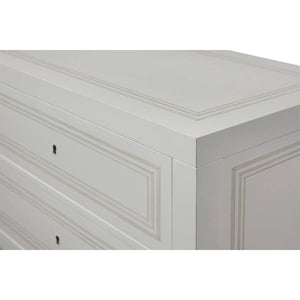 Linen color painted and textured, this bedside chest boasts beautiful gray painted geometric designs on the drawers and side panels that add a touch of timeless elegance.