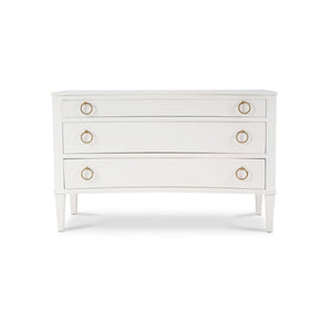 The incurved front adds a distinctive touch, while the three long spacious drawers provide ample storage for your essentials. Each drawer is adorned with elegant ring pulls, adding a touch of refined charm to this exquisite piece.