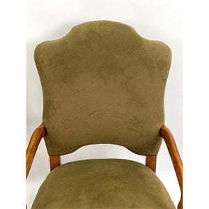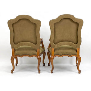 Pair of French Provincial Antique Armchairs, in the 18th century French Louis XV style. A large pair of carved Fauteuils with suede upholstered cushion backrest and seat. With a serpentine top rail and front, with brass nailhead details and raised on carved cabriole legs. France, Mid 20th century