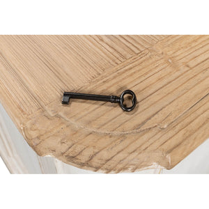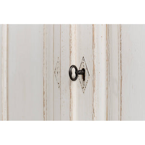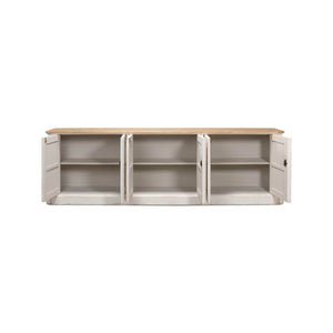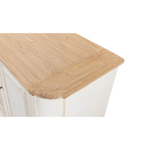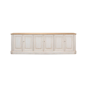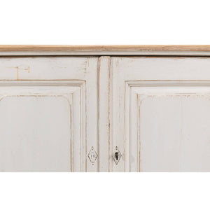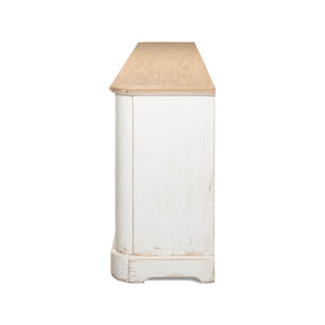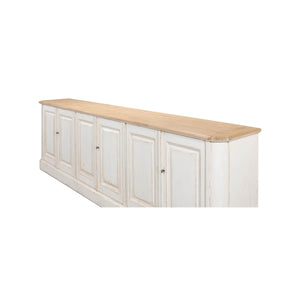Provincial Whitewash Painted Buffet, made with reclaimed pine. The six-door long sideboard buffet is painted in an antiqued rustic whitewash paint and has a natural pine top with a molded edge. The painted interior has removable shelves.
