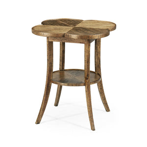 The quatrefoil tabletop design adds a touch of elegance, while gracefully curved saber legs provide sturdy support. A lower round shelf offers additional space for storage or display, making this table as practical as it is sophisticated.