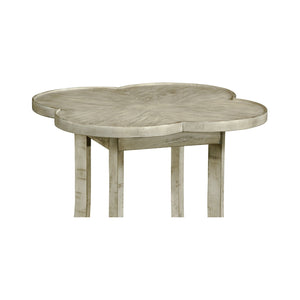 The quatrefoil tabletop design adds a touch of elegance, while gracefully curved saber legs provide sturdy support. A lower round shelf offers additional space for storage or display, making this table as practical as it is sophisticated.