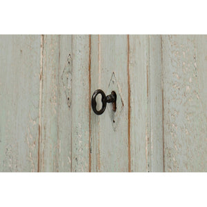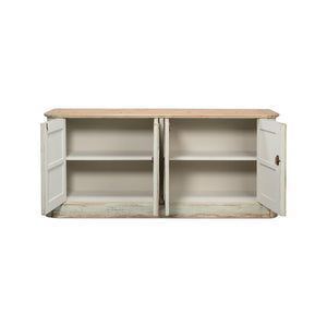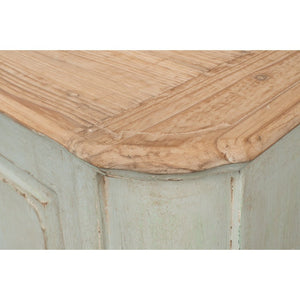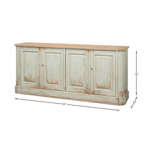 At 83 inches wide, 20 inches deep, and 36 inches tall, its proportions are as inviting as they are practical, offering ample space atop its natural old pine surface for your decorative vignettes or serving spreads. Beneath, the sage painted country-style façade are cupboard doors that open to reveal removable shelves, providing adaptable storage solutions.