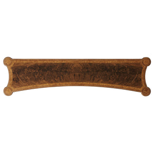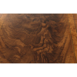 A fine Regency style flame walnut and yew burl veneered console table, the yew burl crossbanded top with a concave front and sides, with protruding rounded corners above three line strung frieze drawers, on turned and fluted tapering legs terminating in brass cappings.