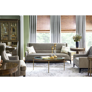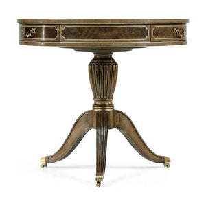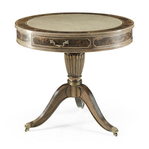 Resting on a reeded pedestal with three splay reeded legs and brass casters, this table combines acacia, leather, and walnut crotch veneer for rich texture and depth. Whether as a centerpiece or accent, the Regency Drum Table enhances interiors with historical elegance and fine craftsmanship.