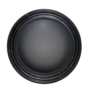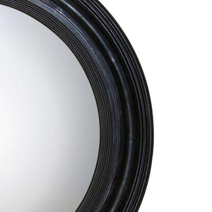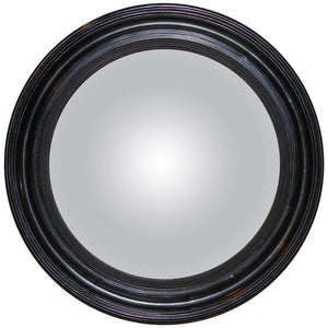 English Regency style ebonized convex mirror with a reeded and molded frame and an antiqued convex glass pane.