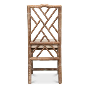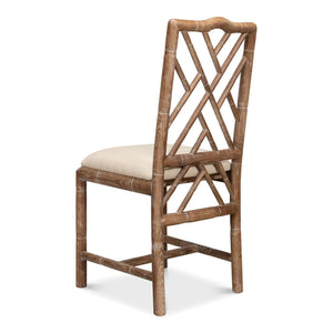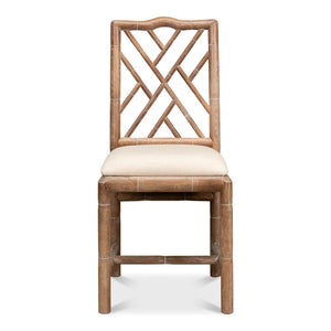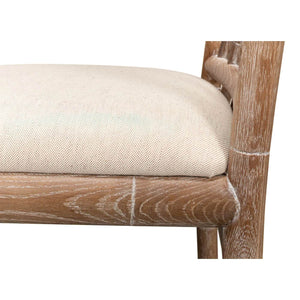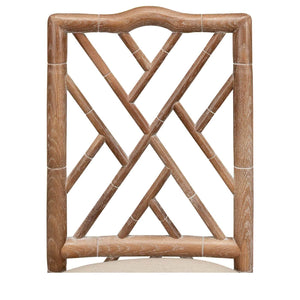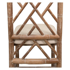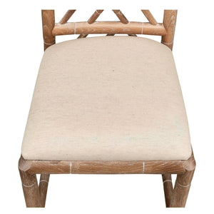 A Regency-style faux bamboo side chair. This hand-carved chair with a faux bamboo motif is inspired by designs of the Brighton Pavillion. It is shown in our whitewash oak finish with a linen seat.