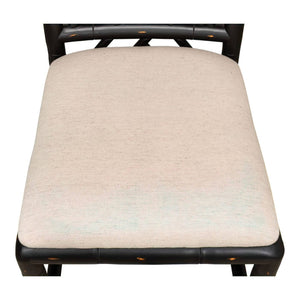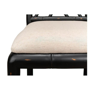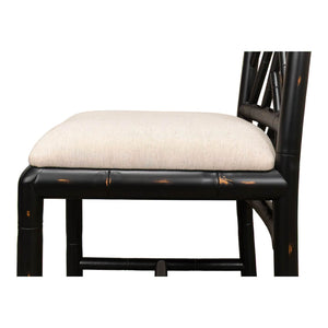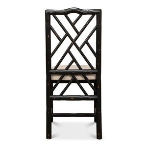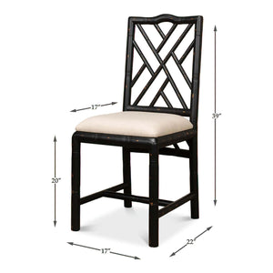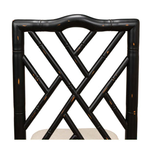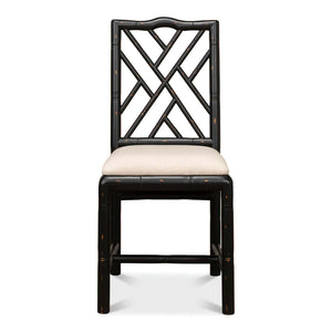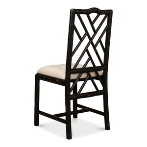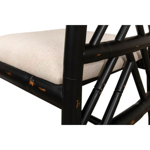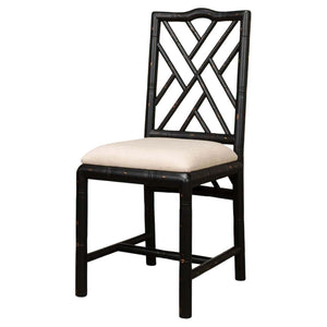 A Regency-style faux bamboo side chair. This hand-carved chair with a faux bamboo motif is inspired by designs of the Brighton Pavillion. It is shown in our black rubbed finish and a linen seat.