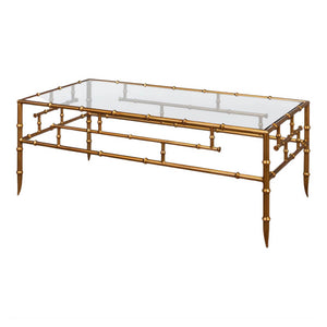 The table's standout feature is its elegant gold faux bamboo iron legs. These legs not only provide sturdy support but also add a luxurious aesthetic to the piece. The gilt bamboo design reflects a timeless Regency style, bringing a sense of refined luxury to your living area.