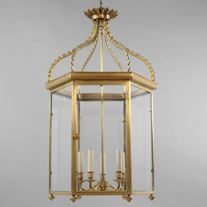 Regency Hall Lantern. This classic lantern is based on a 19th-century six-sided original. Superbly cast, it demonstrates a range of techniques, from the finely crafted frame to the ornately decorative upper section, finished with feathered detailing and a leaf-like top coronet. Hand-fabricated from solid cast brass, with an antique brass finish, and glass panels.