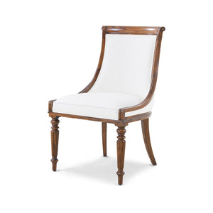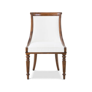 The Regency Mahogany Dining Chair exudes timeless sophistication, blending 19th-century neoclassical elegance with artisan craftsmanship. This hand-carved mahogany scoop-back chair features a paneled and upholstered back above a plush seat, both finished with tailored welting trim. With turned and reeded legs that ground the design with classical poise.