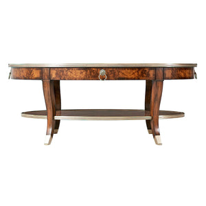 French Mahogany Oval Cocktail Table, A French style mahogany oval cocktail table, with a brass-bound top and under tier, the top fitted with four leather inset slides, on sabre legs.