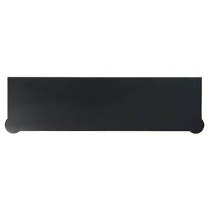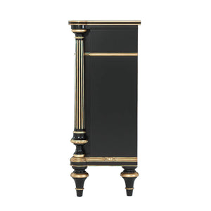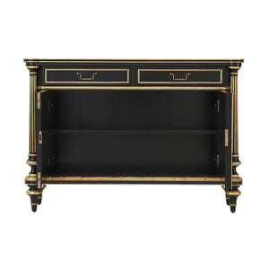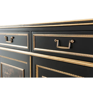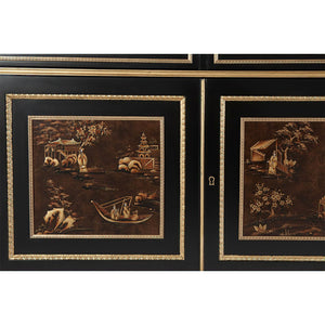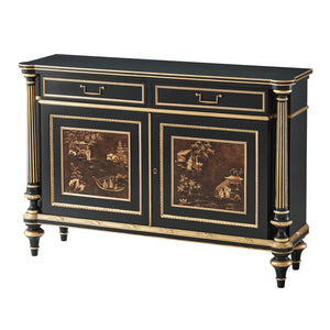 A Regency Style Chinoiserie Cabinet, ebonized mahogany and parcel gilt Chinoiserie side cabinet, the rectangular molded edge top with protruding rounded corners, above two brass molding paneled drawers with brass handles, above two brass molding paneled and carved doors with hand-painted Chinoiserie scenes, the base with bound reed carved details flanked by turned and fluted columns and on turned and tapering legs.