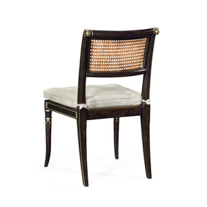 A modern interpretation of a Regency masterpiece, the Regency Style Painted Dining Chair is an exquisite statement of craftsmanship and elegance. Hand-ebonized and meticulously finished, this chair boasts a refined charcoal wash that enhances its timeless appeal. The stunning antiqued silver leaf detailing highlights its sophisticated form, making it an ideal choice for both classic and contemporary interiors.