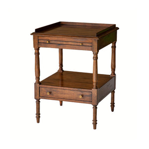 Regency style side table with a wooden gallery top, molded edge, with a pull-out slide about a lower shelf with drawer and turned legs all in a warm country wood tone and hand rubbed finish.