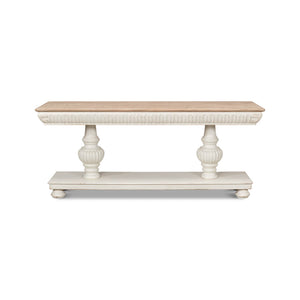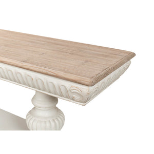 Rustic Antique White Console Table, a dramatic transitional pine console. With a natural wooden top above an antiqued white painted base. With carved volutes around the frieze, atop two carved baluster pedestals.