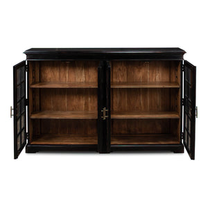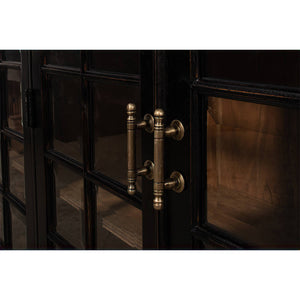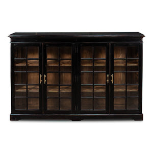 An English Rustic Country house style walnut four-door low bookcase with an antiqued and ebonized exterior, with glass doors and antiqued brass handles. With four adjustable shelves to the interior.