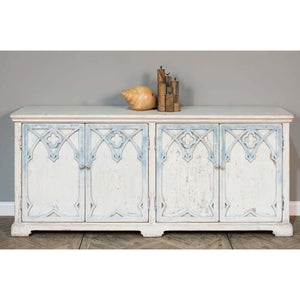 A Rustic French Gothic cabinet. This cabinet has four doors featuring a gothic arch design. A beautiful statement piece, perfect to use as a cabinet or sideboard.