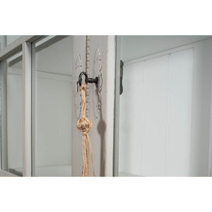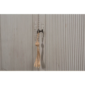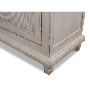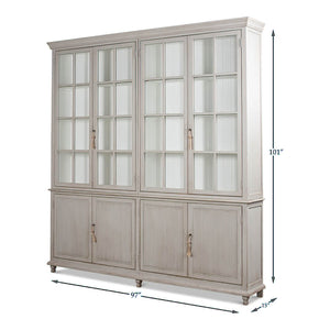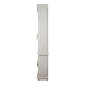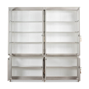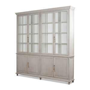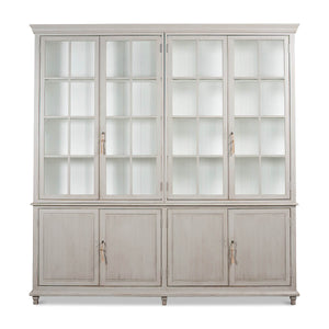 A Transitional Rustic grey painted bookcase with a distressed finish. The upper section with four glass door display sections and a molded cornice. The lower section with reeded panel doors. With decorative antique-style locks.
