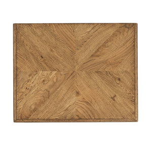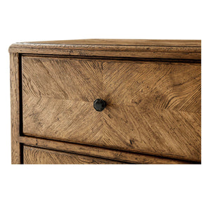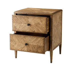 A rustic light oak two-drawer nightstand with a herringbone parquetry design. This beautiful nightstand has two frieze-inspired drawers with Verde Bronze handles. It is supported by two-tier stretcher shelves.